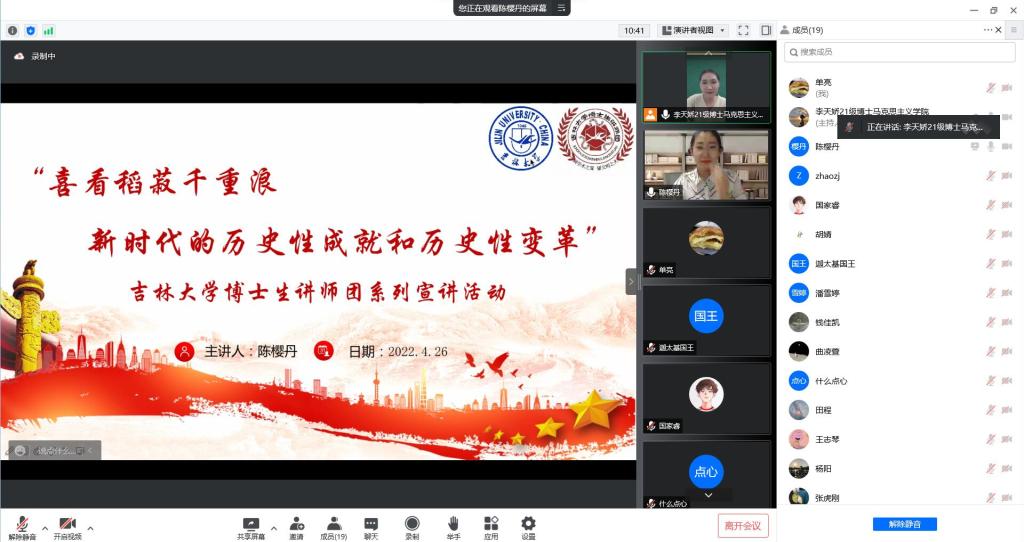 2022年4月26日,公司组织全体研究生观看了“喜看稻菽千层浪——新时代的历史性成就和历史性变革”的吉大博士生讲师团线上宣讲系列活动讲座第六讲,由EMC易倍官网马克思主义公司2021级博士研究生陈樱丹博士主讲的以《以法治为笔以使命为墨,共同书写新时代全面依法治国新篇章》为主题的相关报告。