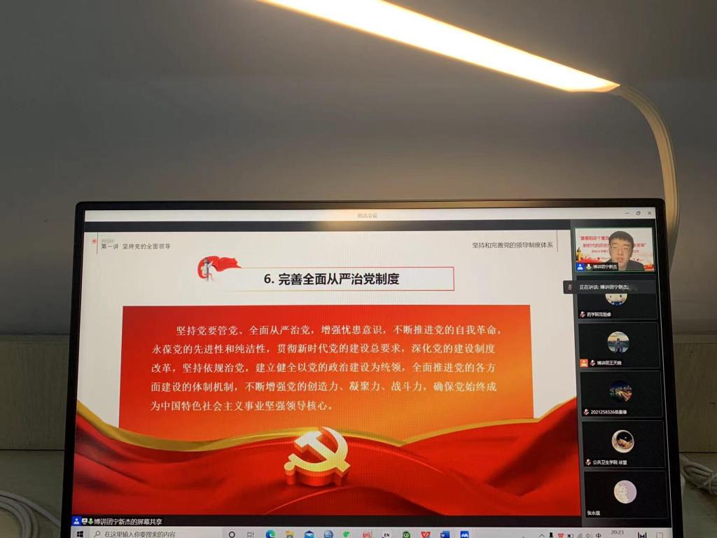 通过宁博士的讲解,同学们更近一步明确了新时代背景下必须坚持习近平新时代中国特色社会主义思想的重要意义,针对如何坚持习近平新时代中国特色社会主义思想必须要做到坚持党的全面领导,党的领导是全面的、系统的、整体的。党政军民学,东西南北中,党是领导一切的,是最高的政治领导力量。坚持和加强党的全面领导,必须理解“坚持党对一切工作的领导“。坚持党的全面领导,最重要的是坚持党中央集中统一领导。其次,坚持和完善党的领导制度体系必须建立不忘初心、牢记使命的制度;完善坚定维护党中央权威和集中统一领导的各项制度,把维护习近平总书记党中央核心、全党的核心地位落到实处;健全党的全面领导制度;健全为人民执政、靠人民执政各项制度,巩固执政党的阶级基础,保证人民在国家治理中的主体地位;健全提高党的执政能力和领导水平制度;完善全面从严治党制度,坚持党要管党、全面从严治党、增强忧患意识,不断推进党的自我革命,永葆党的先进性和纯洁性,贯彻新时代党的建设总要求,深化党的建设制度改革,坚持依规治党,建立健全以党的政治建设为统领,全面推进党的各方面建设的体制机制,不断增强党的创造力、凝聚力、战斗力,确保党始终成为中国特色社会主义事业坚强领导核心。