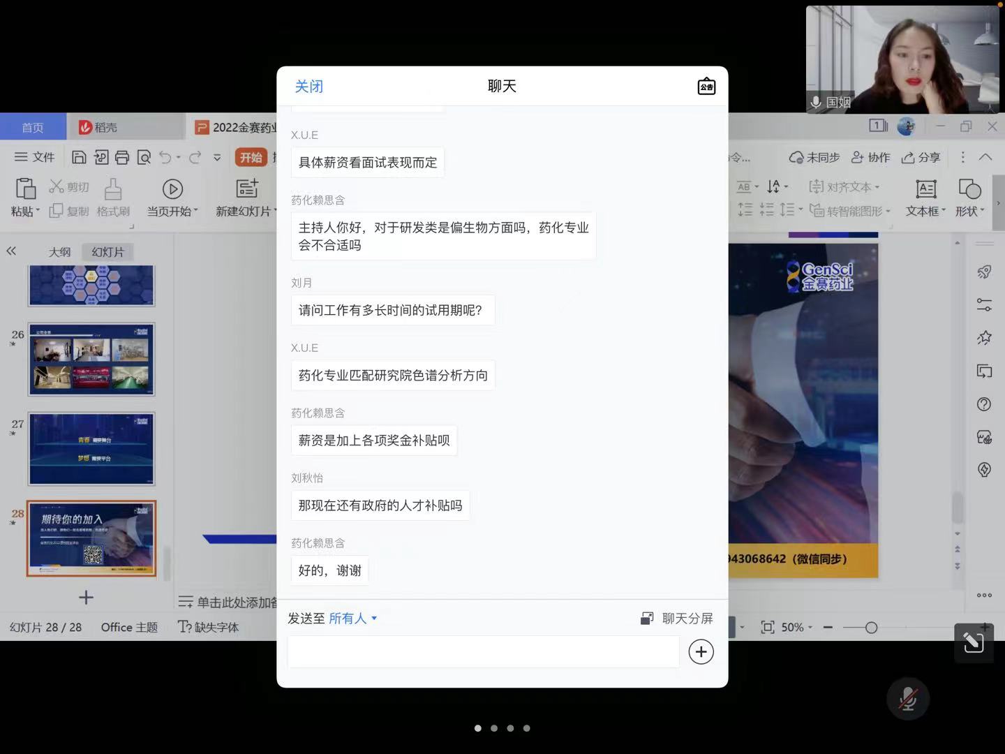 为保证公司毕业生高质量就业,激发毕业生的就业热情,解答毕业生就业相关困惑,应公司校领导邀请,金赛药业于4月23日晚18:30开展2022年春季线上招聘宣讲会,2019级毕业生和2020级相关专业员工均以线上会议的方式参加了本次宣讲会。