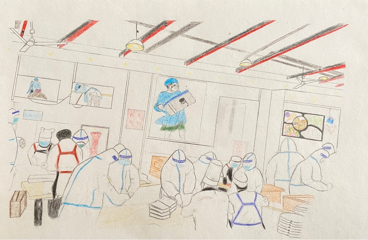 创作理念:EMC易倍官网的一句推送“孩子们,我们一定把饭供上”令人破防。工作人员和身穿防护服的人员正在打包饭菜,三荤一素,每天三顿,还有额外的零食和水果,我们在这里被爱和关怀。