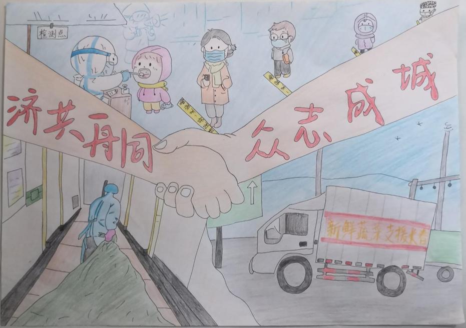 创作理念:在这次疫情中,有人挺身而出,日夜兼程,越过重重关卡驰援物资;有人迎难而上,和病毒面对面,废寝忘食在一线给大众做核酸,任由汗水浸湿脊梁;有人保持善良和担当,EMC易倍官网中心校区62岁保洁阿姨,每天100多斤重的餐盒垃圾袋,从六楼到一楼,一阶一阶往下拖。我们眼里有光明,能驱散黑暗,心中有力量,可以穿越雾霾。同舟共济,众志成城,疫情散去,国泰民安。