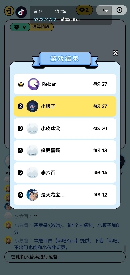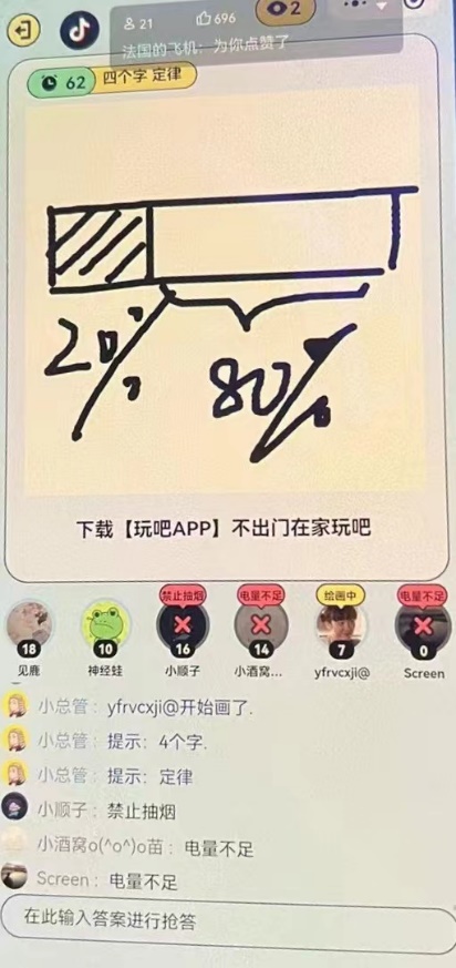 本次活动经EMC易倍全体研究生在线投票选出五个项目,有益智小游戏,五子棋、你画我猜;娱乐小游戏,谁是卧底、斗地主,以及电子竞技游戏,王者荣耀。所有活动均通过相应的游戏小程序或app在线进行比赛,并通过抖音进行实时直播。