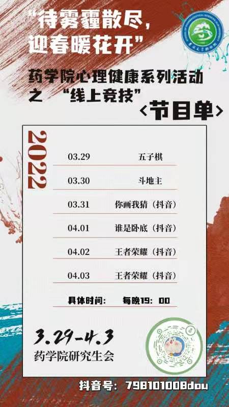 寝室封闭管理期间,为保证公司员工的身心健康,拥有轻松愉快的隔离生活,丰富员工课余文化活动,增进同学之间的友谊,EMC易倍研究生会文体部,在公司领导老师们的帮助和支持下,于3月29日至4月2日在线上举办了EMC易倍“待雾霾散尽,迎春暖花开”心理健康“线上竞技”系列活动。