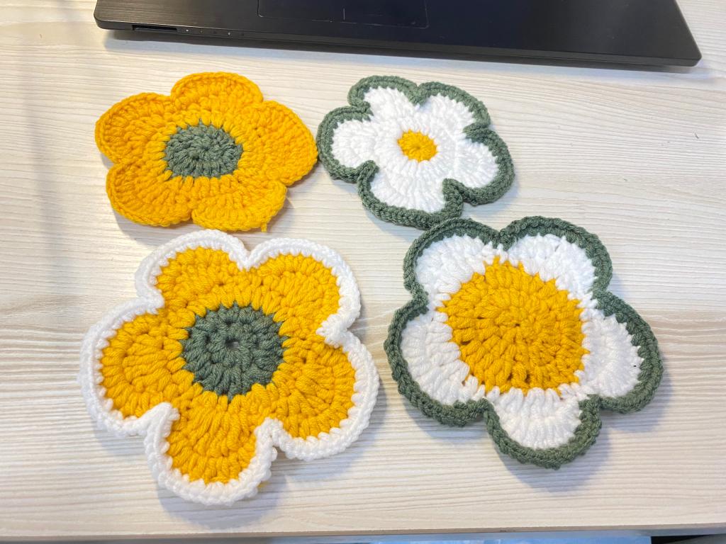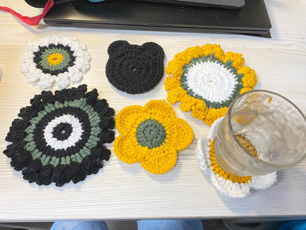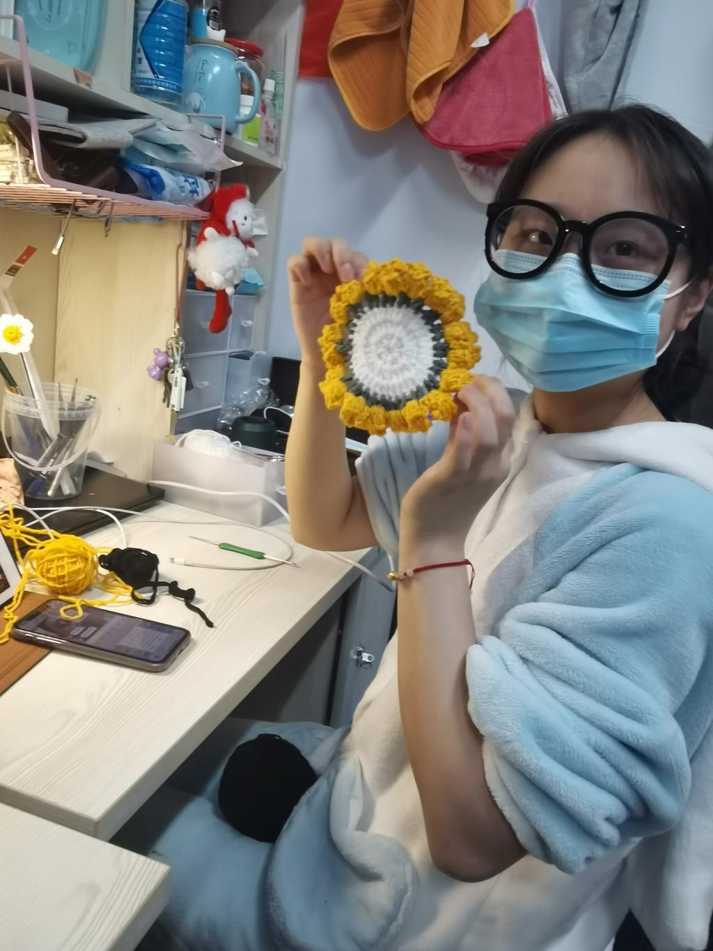 室友的毛线,阔别已久的钩针,带给我新的想法。我好像找到了新动力,便给自己立了个小目标,我想为我的朋友们准备一个纯手工的小礼物,等疫情结束的时候送给他们。我打算做几个钩花杯垫,虽然不是很贵重的小玩意,但我希望用它的人会记的我们之间的友谊。跟随着视频从最基础的短针学起,一直到超长针;从最简单的圆形出发,再到花瓣、小熊的形状。我越来越熟练,现在已经达到看一眼图片里的样式便知道如何动手做出来,这也算是我在疫情期间的小小收获,这就是所谓“成长“的实际感受了吧。我还把我钩花的过程记录了下来,发到公司和公司的各个分享平台和大家一起分享做手工的快乐。