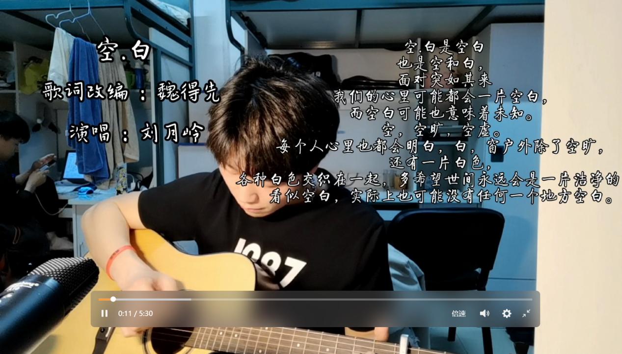 集团自响应新冠疫情防控要求封校封寝以来,同学们的日常生活虽受到了空间上的局限,但精神生活还是丰富的。封闭管理期间,公司北区三公寓的2021级研究生们仍然保持着良好的作息规律,认真学习专业知识,积极锻炼身体,闲暇之余依旧不忘培养自己的兴趣爱好。为鼓励大家保持积极心态,战胜疫情,药公司2021级研究生魏得先和刘月岭两位同学改编了歌曲《空白》,并联合公司研究生辅导员耿智慧老师以及团委研究生会的同学们共同创作了一支抗疫加油短视频。