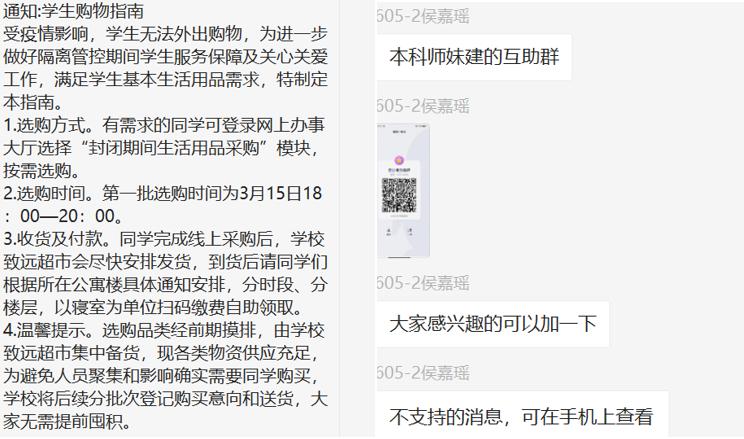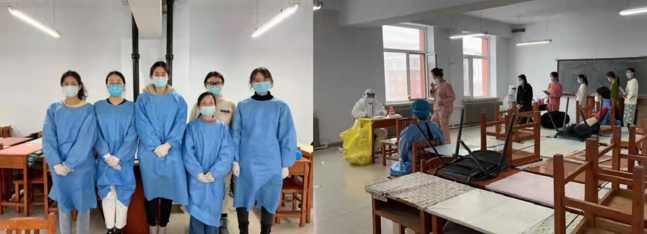 “疫情就是命令,防控就是责任”,面对疫情,药学的员工干部们、党员同志们积极响应号召,各年级各班级同学都积极报名参与志愿者工作,各公寓楼建立互助微信群,同学们互帮互助,大家都在用实际行动去构筑属于自己的青春防线。在外志愿者们是风雪中的战士,在宿舍楼里志愿者们是输送温暖的守卫者。早上7:00的早饭时间,中午11:30的午饭时间,晚上17:30的晚饭时间,志愿者们都准时有序地将食水送到六层楼里的各个宿舍进行分发,女孩子们蓝色、白色的身影出现在四公寓的各个角落。志愿者们除了保障同学们的食水之外,严格按照防疫要求,负责组织分发核酸自测试剂盒并有序组织统一做核酸,让同学们安全有序的进行核酸检测,此外还参与消杀工作,新民四公寓的女孩子们工作量不可谓不大,不可谓不辛苦,但勇敢善良的女孩子们从不言苦、迎难而上,用自己并不强壮的肩膀承担起一栋楼的安全。