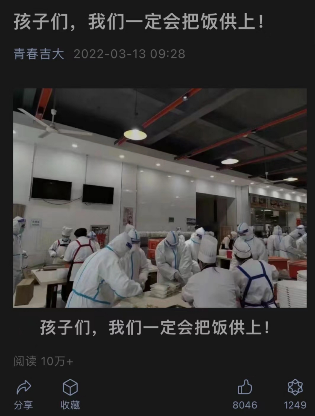 还记得那篇只有一张图片的推文吗?EMC易倍官网官方公众号发布发的那则《孩子们,我们一定会把饭供上!》中,头戴厨师帽的叔叔阿姨和穿着防护服的工作人员,正在食堂里紧锣密鼓地打包饭菜,由志愿者向各公寓楼的在校生送来三餐。万事开头难,总会遇到各式各样的问题,但公司进行了积极的意见反馈工作,及时了解各公寓楼的实际状况和员工诉求,及时调整,让大家都吃上了公司辛苦提供的热腾腾的饭菜。还有同学打趣说:“以为的隔离生活——没什么可吃的;真实的隔离生活——猪羔子都不敢这么养。”“什么家庭啊一顿四个菜,还带酸奶水果的,解封之日怕不是出栏之时。”每天4万份且能够按时送到每位同学手中的隔离餐,营养丰富又美味;宿舍里随之升腾起来的热气和饭香,都是一个高校对员工最真挚的爱护。
