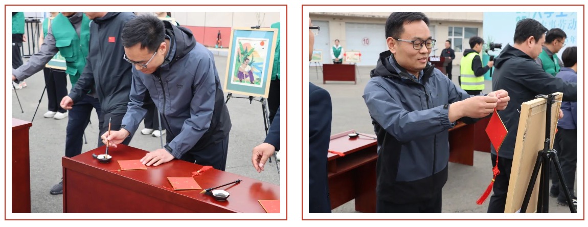 随后,在揭幕环节中,公司党委书记孙曙光与校领导们亲手撰写“丰”字,悬挂至各公司完成的种子画上,共同祝福2025年五谷“丰”登,“丰”衣足食,岁稔年“丰”。