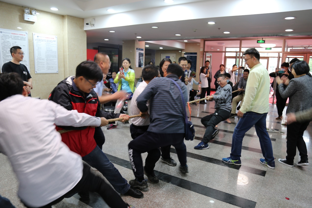 接下来,进入到庆祝活动游戏环节。首先进行了拔河比赛,大厅内人声鼎沸,热闹非凡,与室外阴雨连绵的环境形成了鲜明对比。