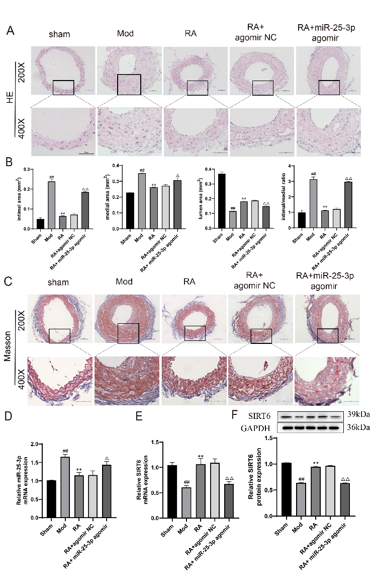 在体内实验方面,RA能够有效减轻内膜增生的程度,而miR-25-3p mimics则可部分逆转RA对血管重塑的抑制效应(见图4)。