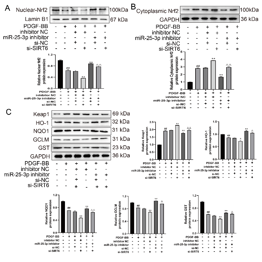当SIRT6被敲低后,miR-25-3p inhibitor对PDGF-BB诱导的VSMCs 增殖、迁移及表型转化的抑制作用,出现了部分减弱的现象;同时,miR-25-3p inhibitor对PDGF-BB刺激所引发的核因子E2相关因子2/抗氧化反应元件(Nrf2/ARE)信号通路的抑制作用,在SIRT6敲低后反而进一步增强(见图3)。
